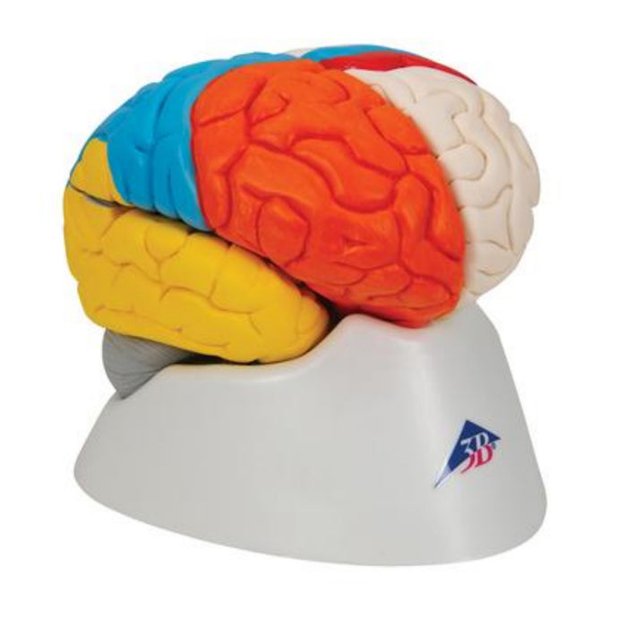 Ce cerveau de luxe est divisé médialement. Sur la moitié droite de ce cerveau, vous trouverez un regroupement et une représentation colorés et systématiques des lobes cérébraux. La moitié gauche du cerveau montre :